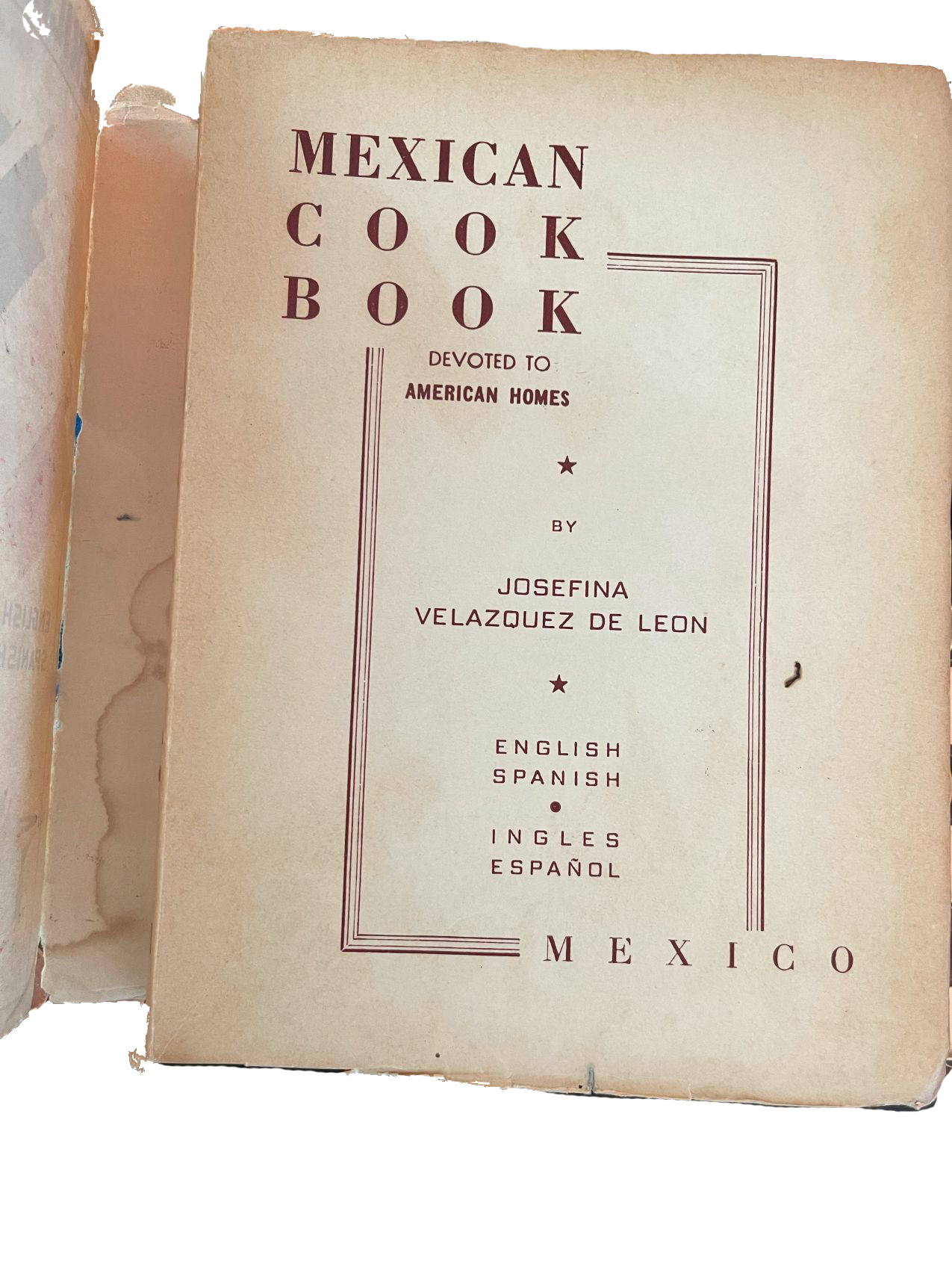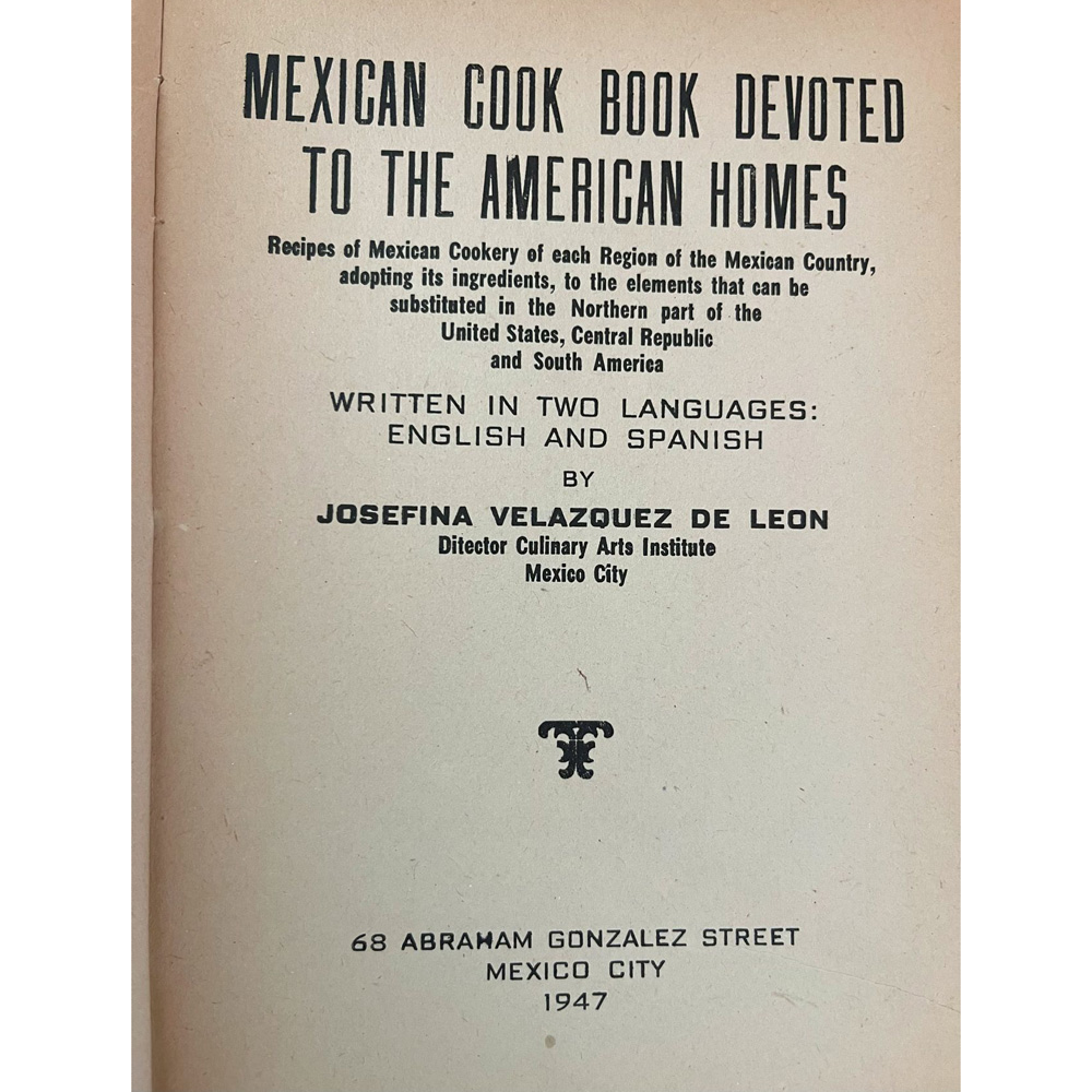 Josefina Velázquez de León (1899-1968) was a pioneer of Mexican gastronomy and an entrepreneur of Mexican cuisine. In 1947, she published Mexican Cook Book Devoted to American Homes. This bilingual English and Spanish, Espanol y Ingles, cookbook is the first Mexican cookbook published in the United States, introducing authentic cuisine from every region of Mexico to an American audience.